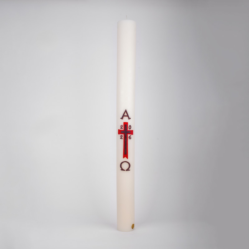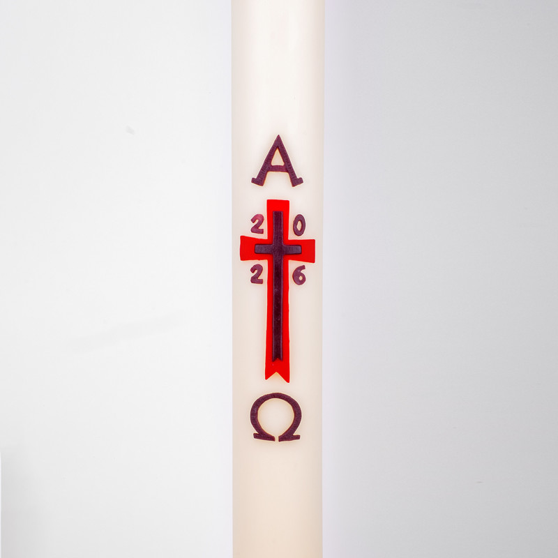 L’année. Dans chacun des angles formés par la croix figurent les chiffres de l’année en cours. Avant d’allumer le cierge, le prêtre trace la croix, l’alpha et l’omega ainsi que le chiffre du millésime de l’année et dit: «Le Christ, hier et aujourd’hui, commencement et fin de toute chose, alpha et oméga, à lui le temps et l’éternité, à lui gloire et puissance, pour les siècles sans fin. Amen.»