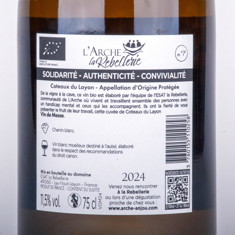 Bouteille de vin de messe Bio 75cl Coteaux du Layon (France) L'Arche de la Rebellerie 11.5%vol. Millésime 2024.
